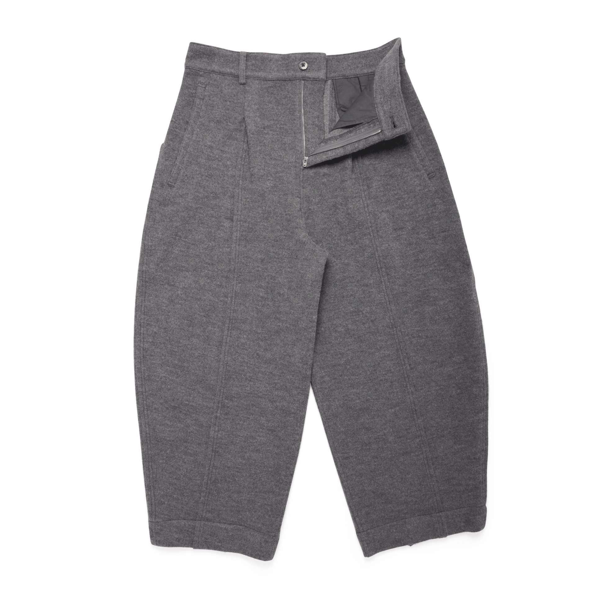 Our wool Cottonopolis Pant, referencing Manchester’s rich history within the cotton and wool industry by means of its 19th Century nickname [Cottonopolis] and material DNA. The pant dons a balloon shape with a raw edge seam running down the middle of the left and right pant leg, front and back. It has a doubke dart seam pleat to the front and slanted buttoned pockets to the back.