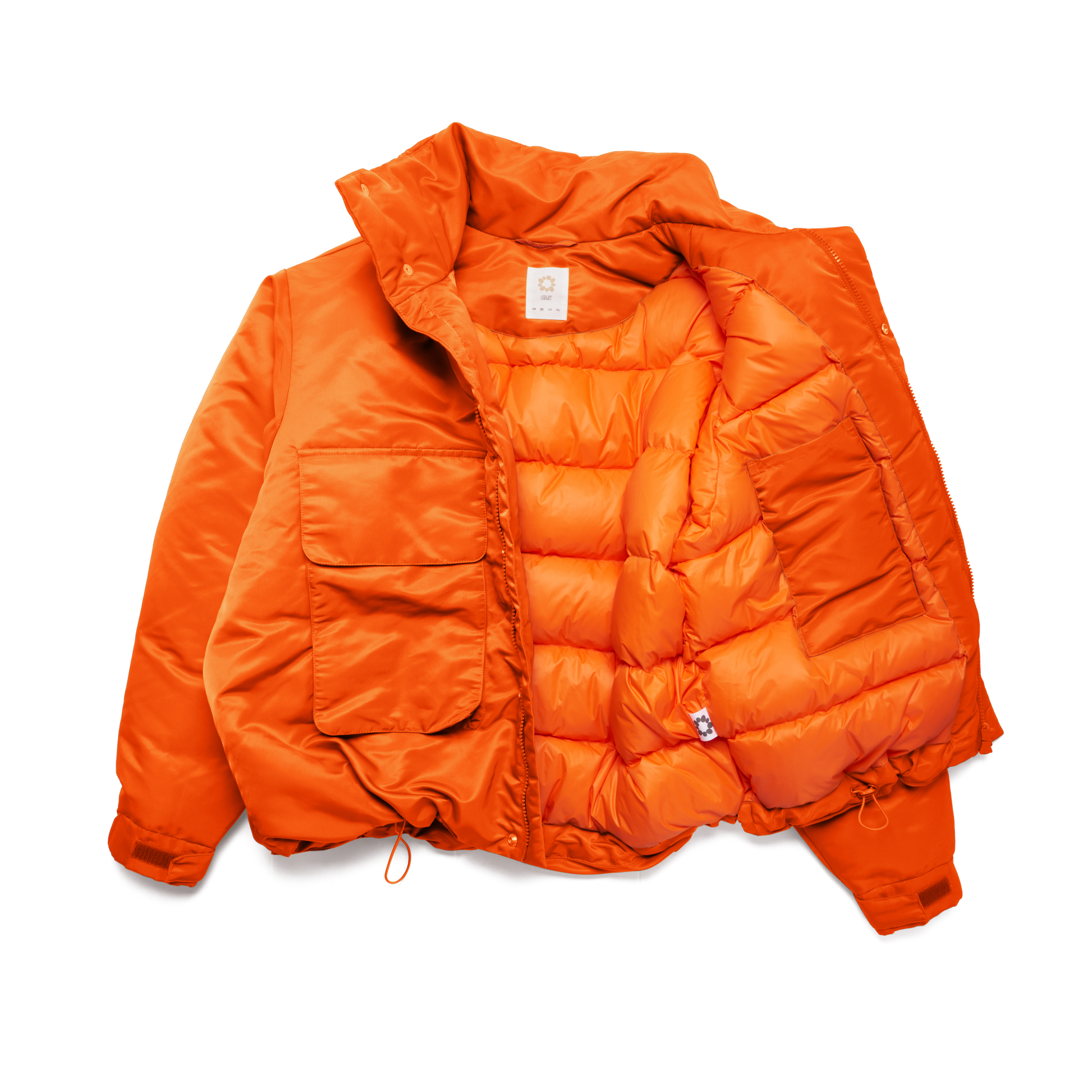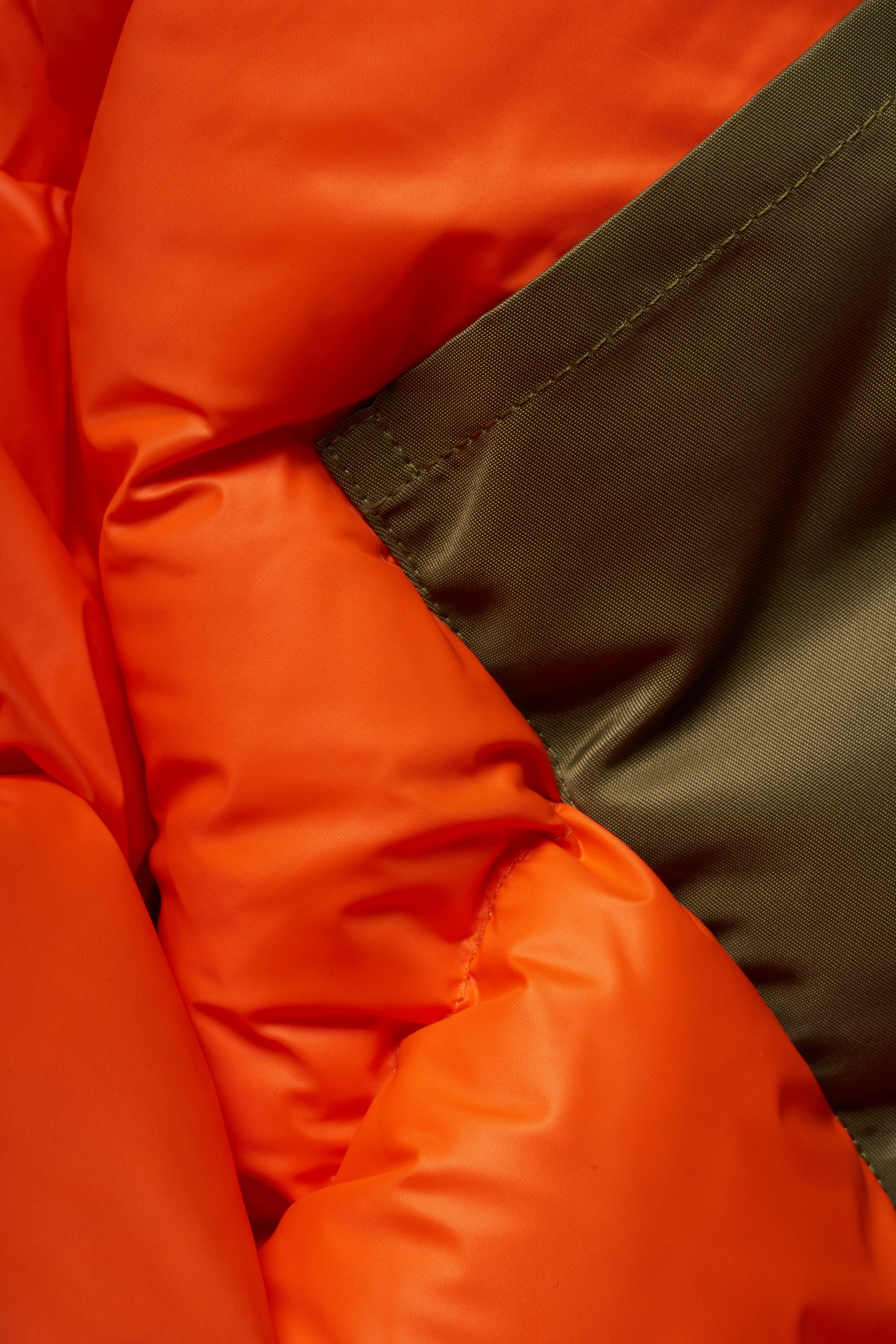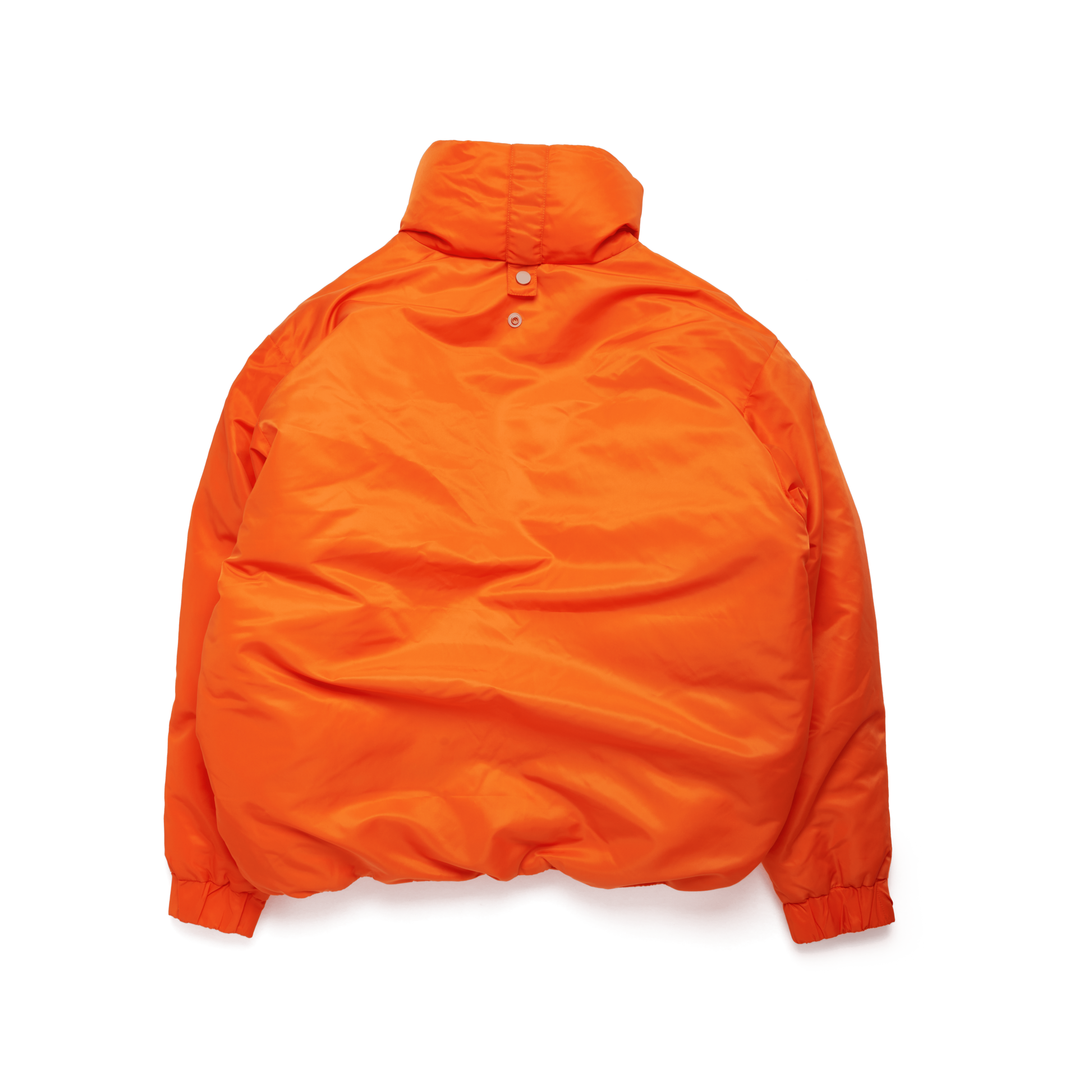 Stand Collar (Snap Buttons to adjust Collar Height), Snap Buttons to Front Body, Toggle Adjuster to Hem, Nylon Outer Layer, Two Gusset Pockets to Body, Two Hand Warmer Pockets, Duck Down Filling. Available in Black, Orange, Olive.