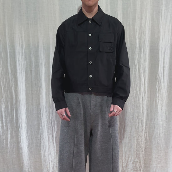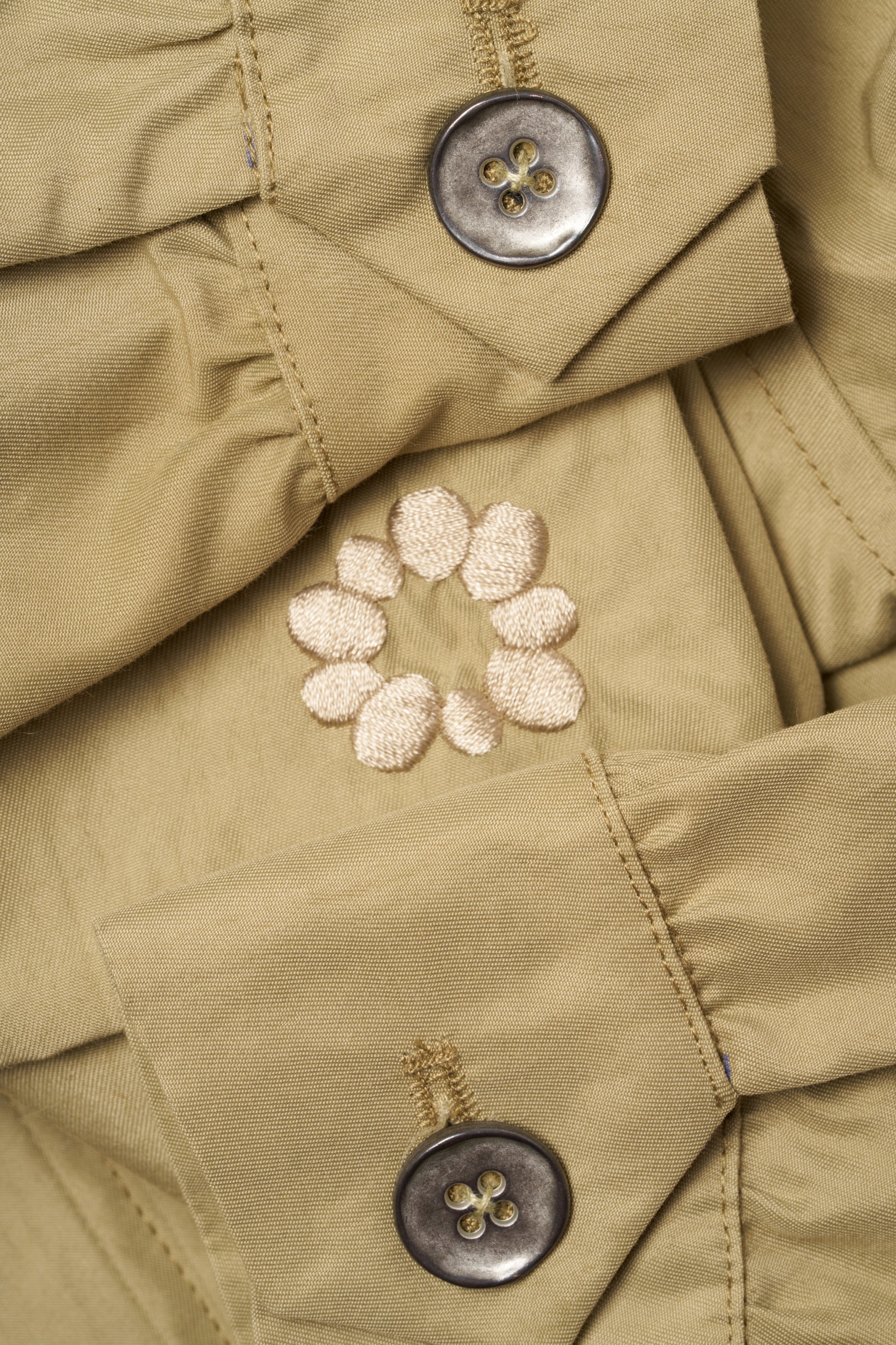 Cotton-nylon left-twill fabric. While it may appear ordinary from a distance, a closer look reveals a shiny, slightly wrinkled texture. One side features cotton, while the other side highlights nylon, offering a double-sided contrast effect. This fabric stands out from typical windbreaker materials.