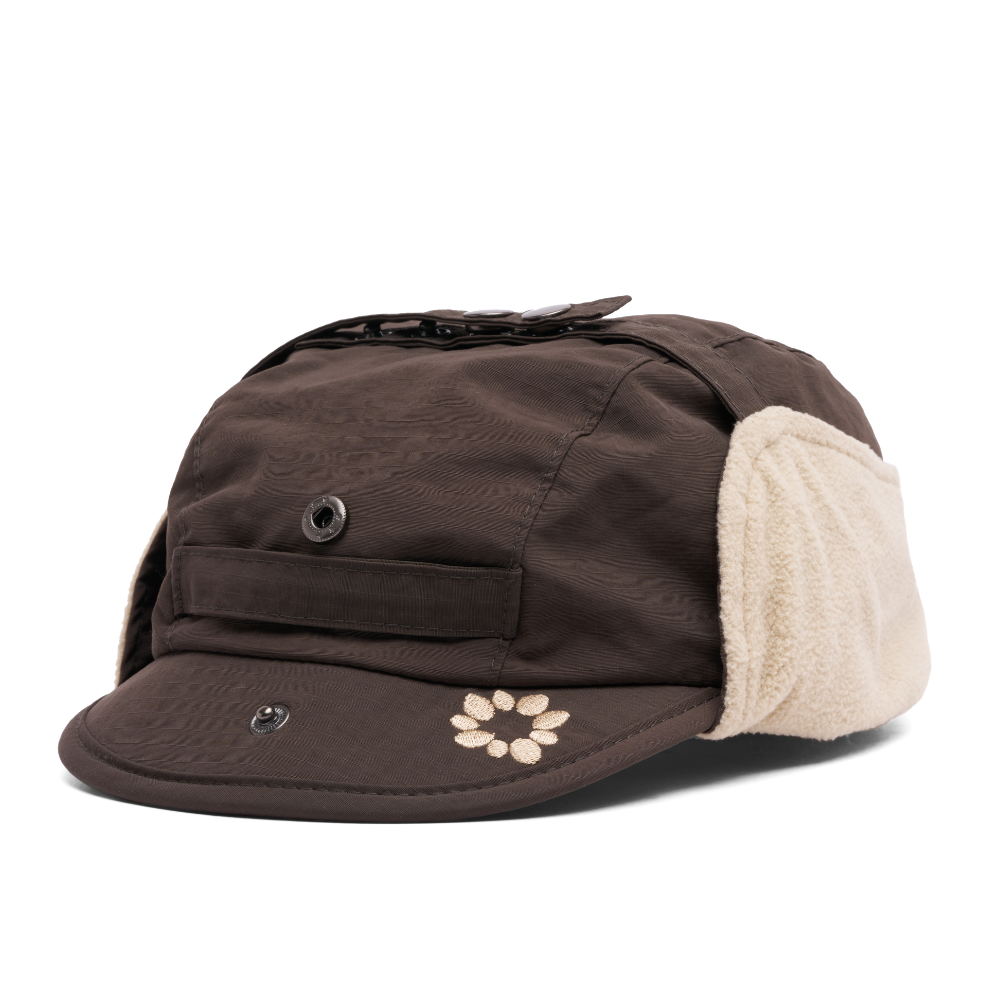 Mountain hat. Nylon outer. Fleece lined. Short brim. Ear flaps with button fastener. Available in Black and Brown.