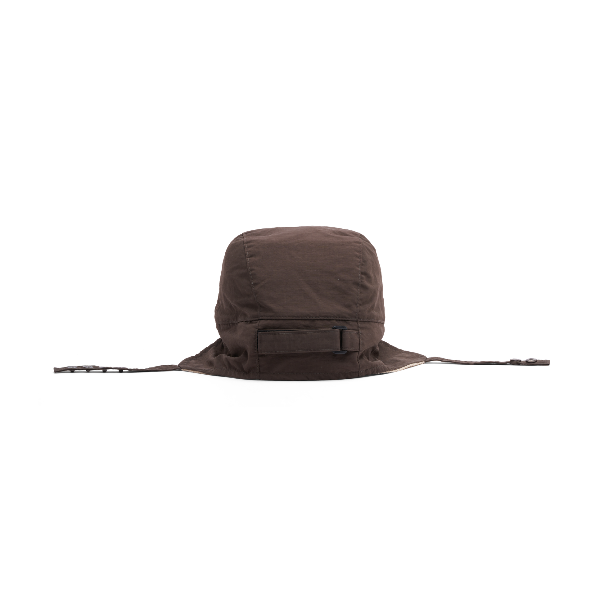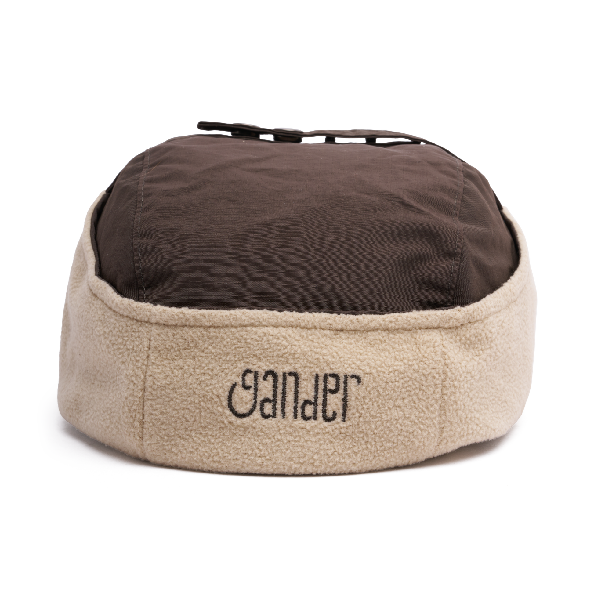 Mountain hat. Nylon outer. Fleece lined. Short brim. Ear flaps with button fastener. Available in Stone.